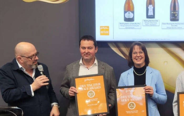 Beim VINUM Deutschen Sekt Award 2026 haben wir mit 94/100 Punkten den 1. Platz unter den Riesling-Sekten geholt! Bei 512 eingereichten Sekten macht uns diese Auszeichnung besonders stolz. Die feierliche Urkundenverleihung fand im [ ... weiter lesen ]
